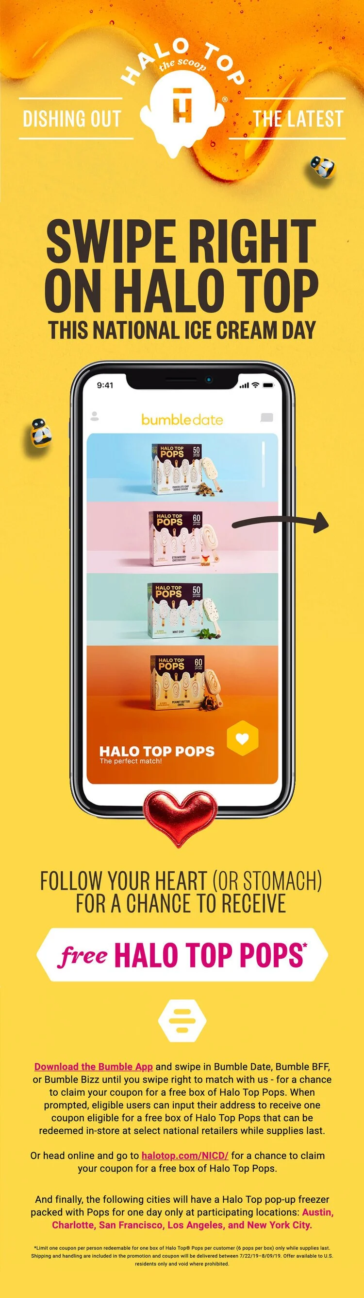 Halo Top and Bumble have teamed up this National Ice Cream Day to bring fans their perfect match this summer — Halo Top Pops! Whether fans are looking to connect with someone romantically, platonically, or professionally, all eligible Bumble users in the United States will have the chance to get a coupon eligible for a free box of pops while supplies last. Regardless of their relationship status, fans can follow their heart (or their stomach) with this in-app chance to sweeten their summer.